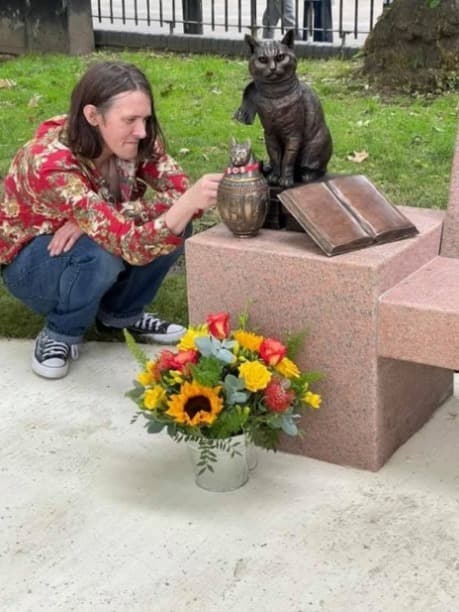 En la foto aquí está James Bowen honrando amorosamente a Bob, junto a las flores y una pequeña urna con su nombre. Esta estatua no es solo un monumento a Bob, sino también un símbolo de amistad, lealtad y el poder de las segundas oportunidades.