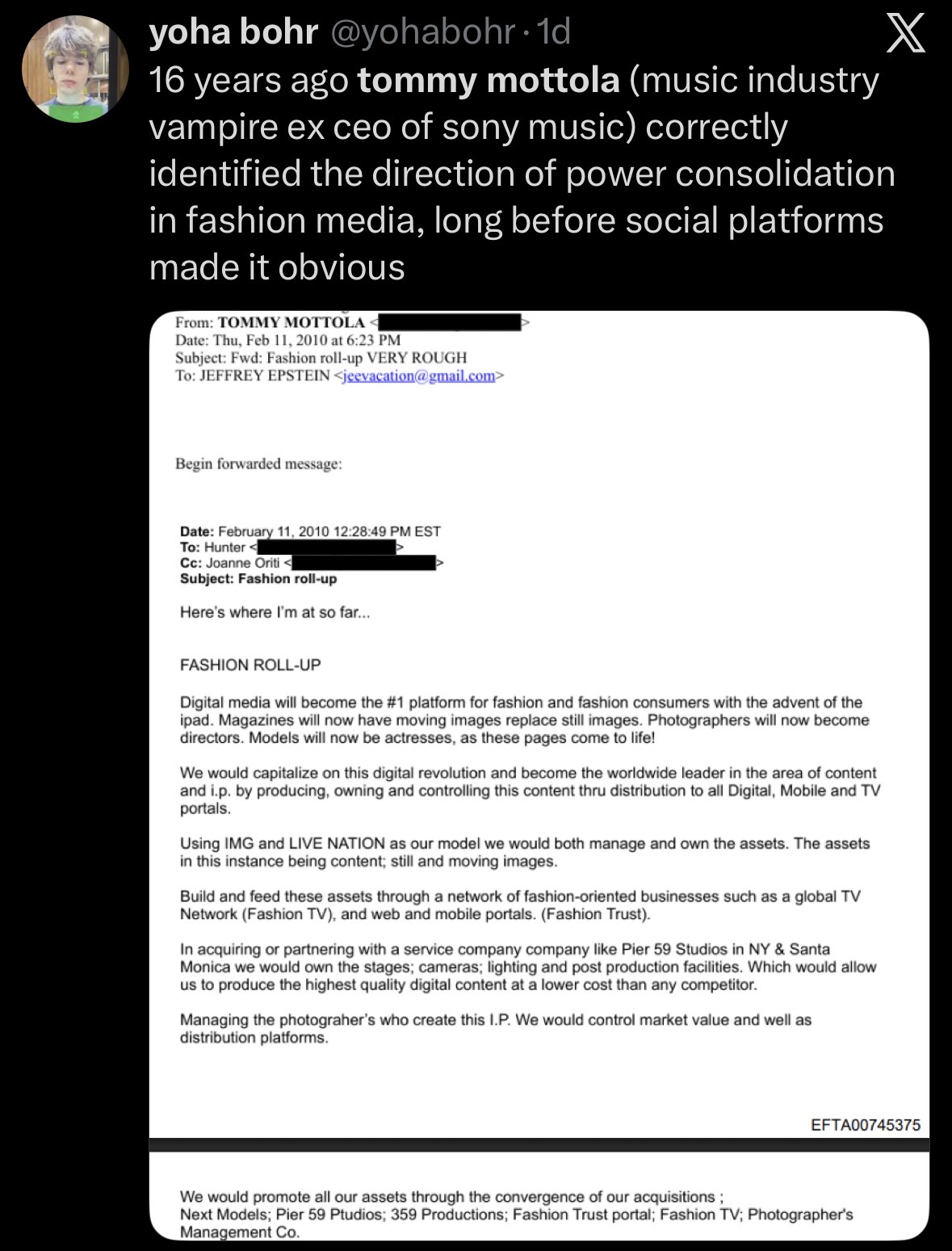 Probablemente sabe o piensa que no hay una prueba contundente que diga que estuvo follándose a menores en una isla y por eso está sin inmutarse demasiado (o puede que no follara a nadie de verdad no se), puede argumentar que era amigo del tipo sin saber a fondo que hacia el de puertas para adentro, es decir, para poder joderlo contundentemente tiene que salir algo que diga que literal y explícitamente estuvo sexualmente con alguien menor, de lo contrario si lo acusan de algo y con los buenos abogados que puede pagarse saldrá airoso de no haber algo más contundente que conversas aleatorias que no dicen que iba a las fiestas esas y participaba en encuentros. Igual salen un montón de famosos teniendo amistad o conversas con el tipo pero no necesariamente eran partícipes de lo que hacía el pedófilo ese.