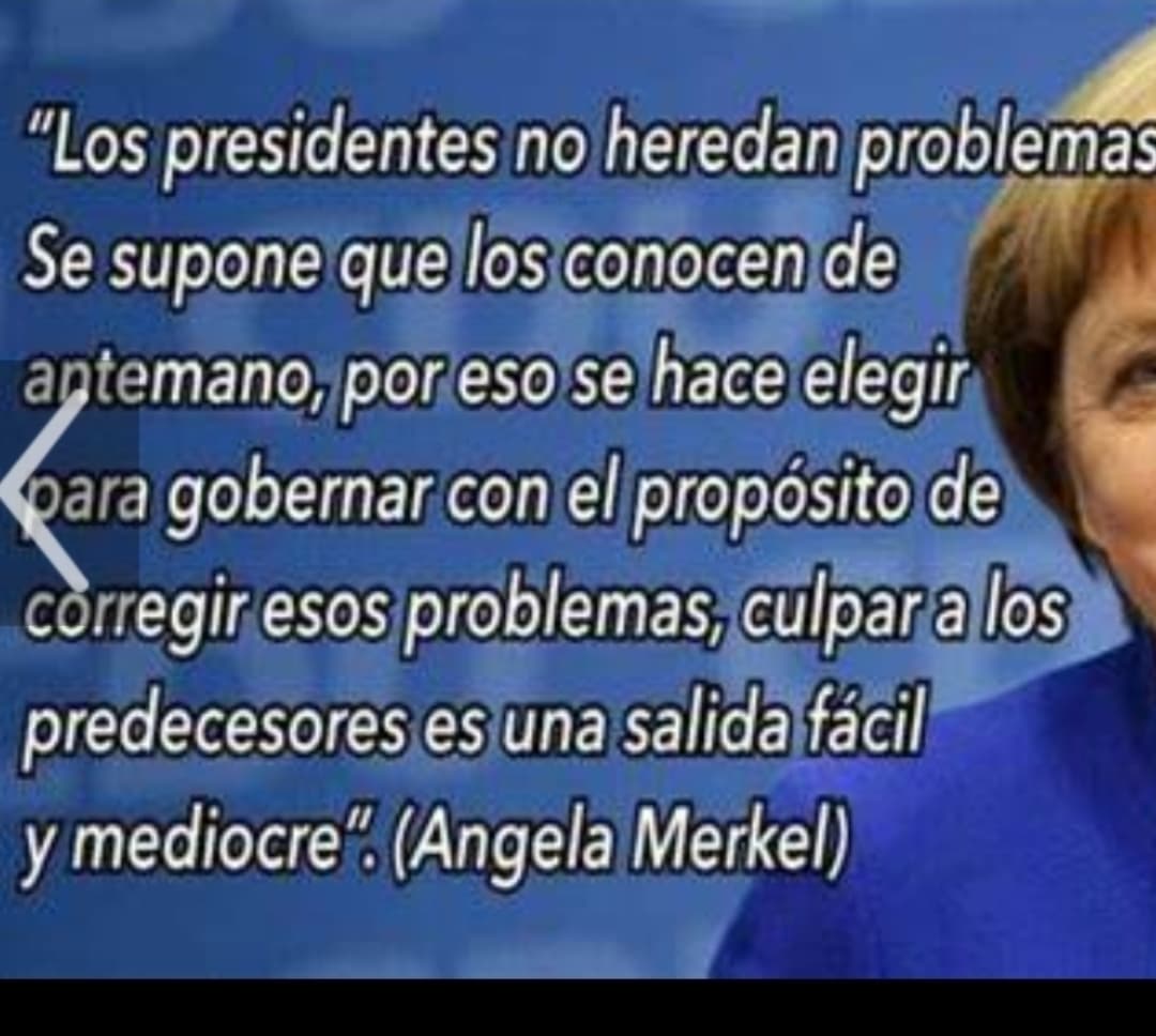El motivo de la cita de Angela Merkel de Alemania es que NINGUN PRESIDENTE HEREDA PROBLEMAS, ESOS PROBLEMAS LOS CONOCÍAN PARA HACERSE ELEGIR Y SOLUCIONARLOS.