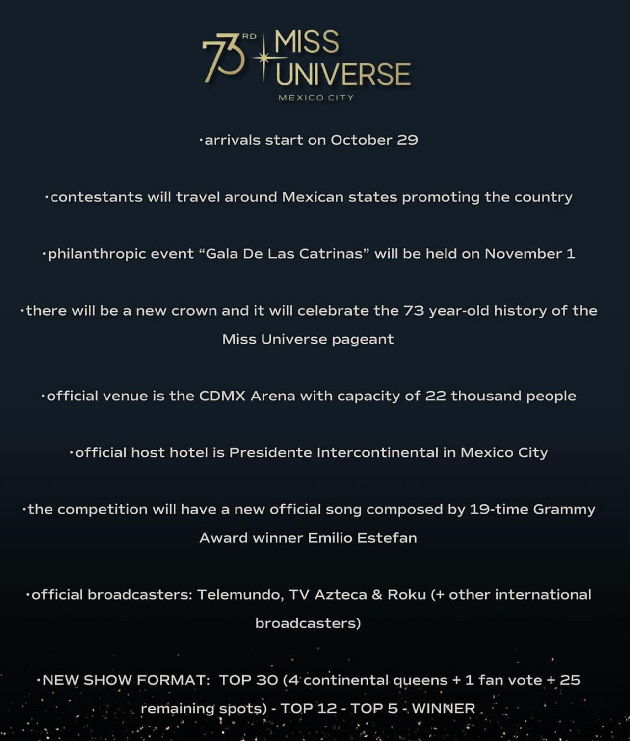 • Formato de la final será, Top 30 en traje de baño (4 reinas continentales y una votada por el público más las 25) top 12 en traje de gala. Top 5 y después la ganadora.