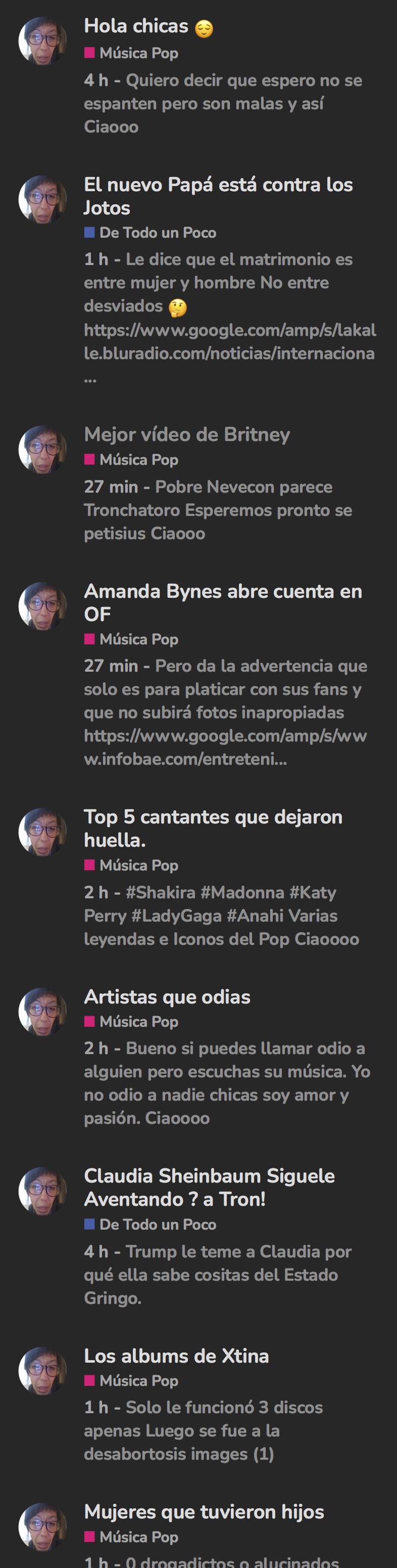 @MissKitty Limítate a abrir temas relacionados con la temática pop o musical. Tienes foros como De Todo un Poco y Infidelidad & Sexo para esos temas que gustas publicar aquí.
