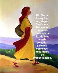Oración: ¡Oh María peregrina, oh María Purísima!. Haz que te imitemos llevando la luz de Dios a cada corazón, y siendo como vos, testimonio de evangelización. Amén.