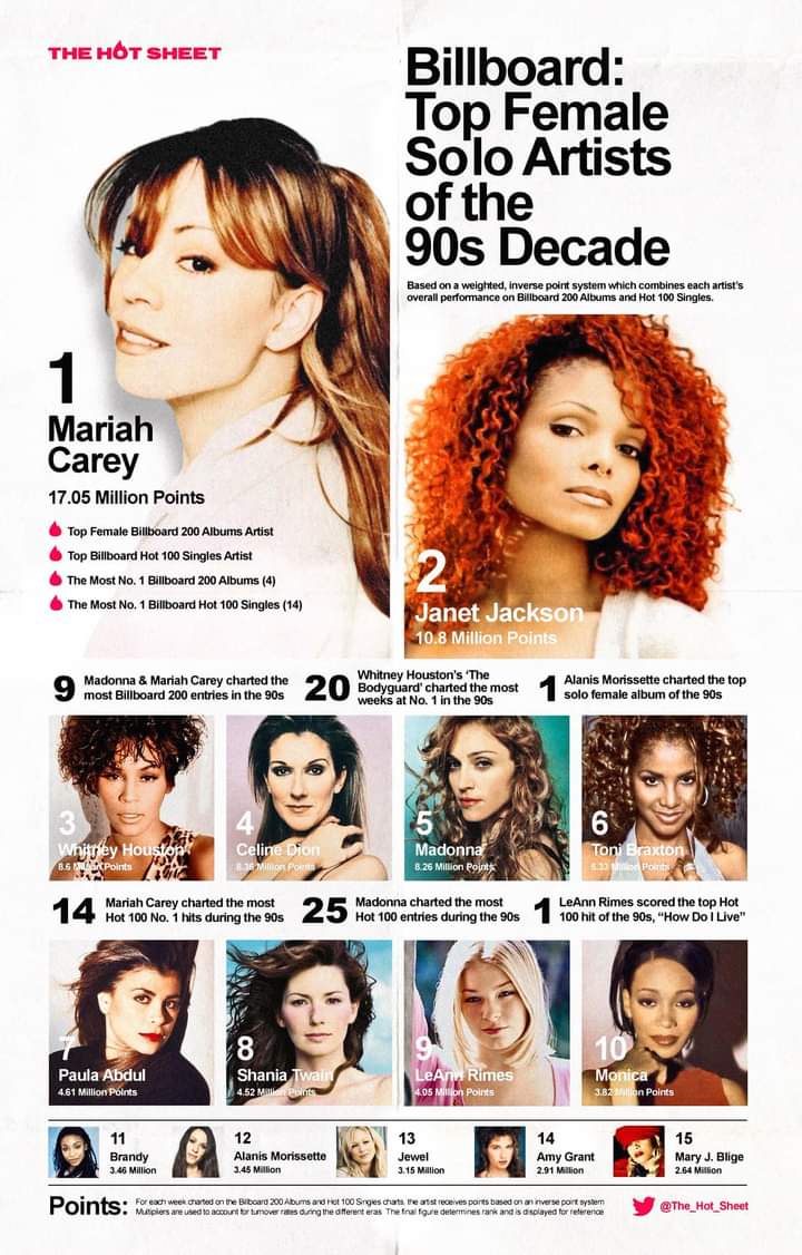 Y los 90 fue de Mariah, Janet, Celine, Madonna y Whitney segun Billboard