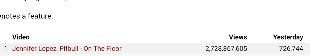 Jlo epica el día de ayer su mega hit atemporal longevo de 2011 On the floor hizo el día de ayer más de 1, 7 millones de streams Youtube + Spotify superando a los mega hits de Shakira Waka Waka y hips don’t lie y sin necesidad de colgarse de mundiales de futbol y tampoco colgarse de su ex .