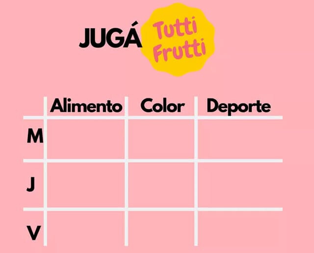 Esta facil amiga mira tienes que poner una comida con M un color con la M y un deporte con la M