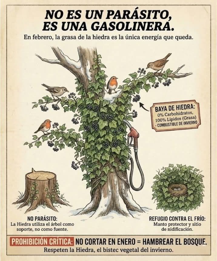Refugio Invernal: El espesor de la hiedra actúa como un abrigo, protegiendo a las aves (carboneros, chochines) de los vientos fríos y la nieve.