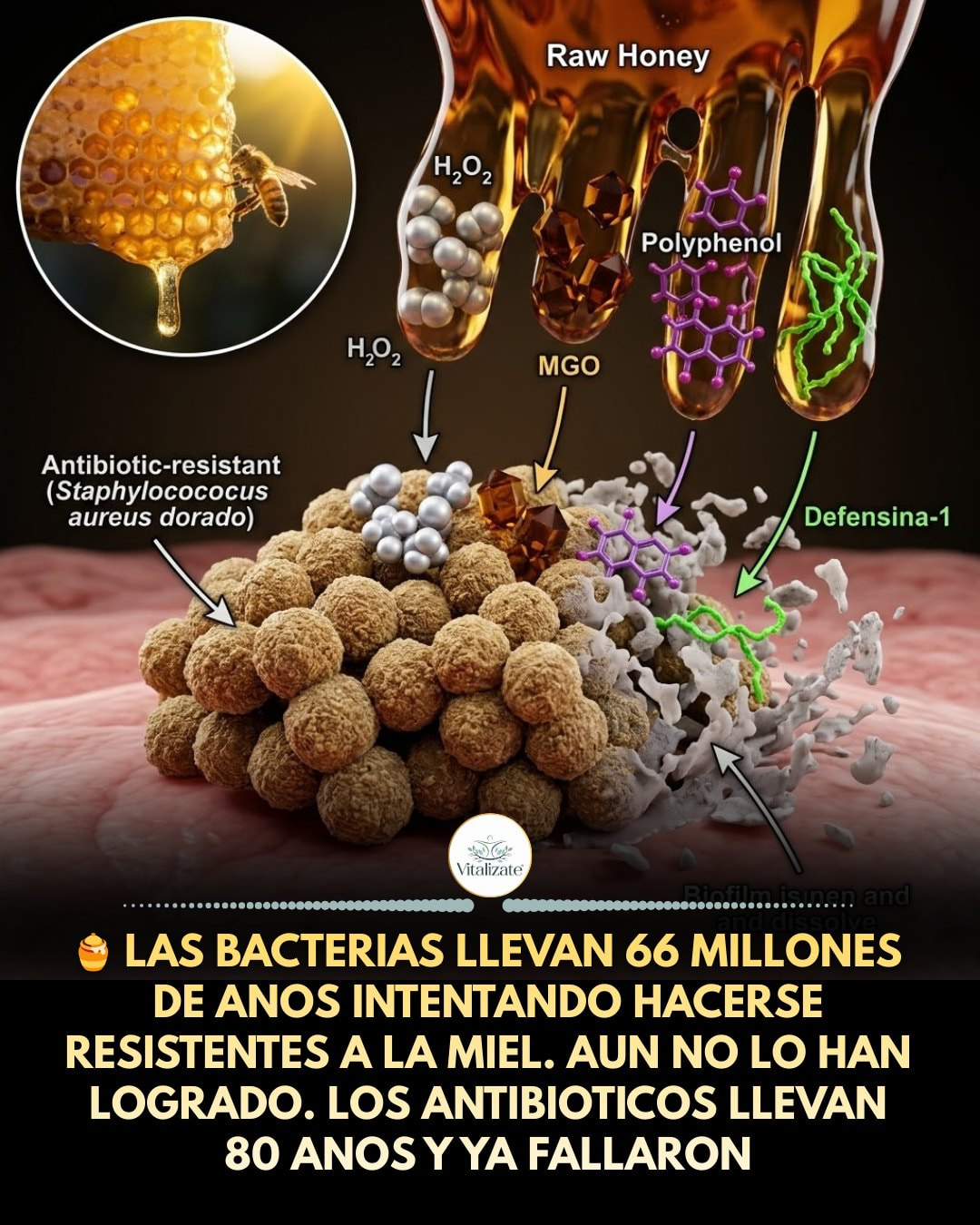 Defensina-1: proteína de abeja depositada en la miel durante su producción. Bloquea la síntesis de pared celular bacteriana, exactamente como lo hacen la penicilina y los beta-lactámicos, pero sin generar resistencia.