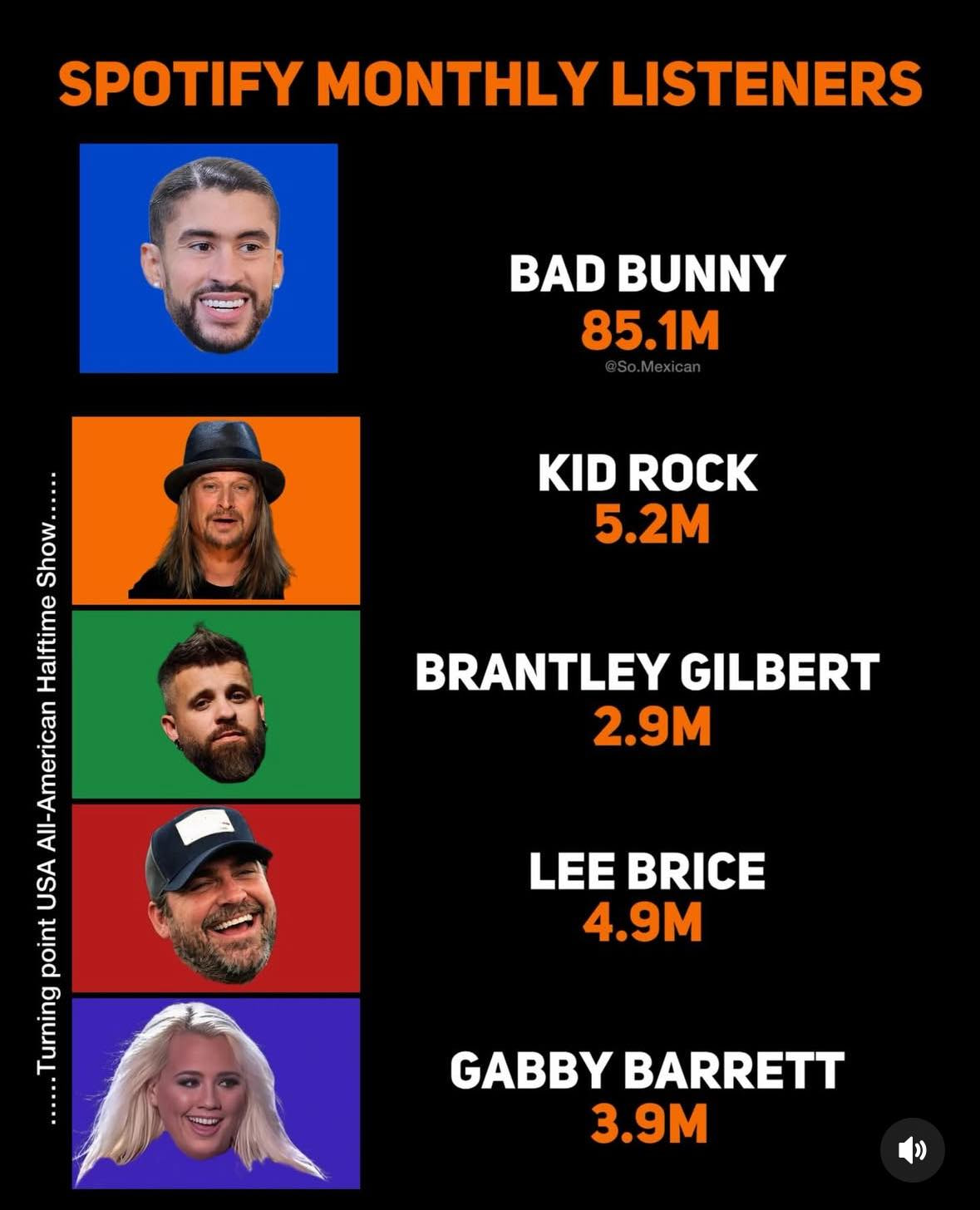 Online discussion has shifted toward reach and relevance. Bad Bunny enters the night as one of the most streamed artists in the world, with tens of millions of monthly listeners and a global audience that spans languages, borders, and generations. By comparison, the combined Spotify listeners of Kid Rock and the other artists attached to the alternative show trail far behind, a gap fans say reflects broader shifts in music culture and who today’s audiences are actually tuning in for.