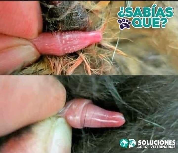La primera imagen muestra el órgano genital de un gato macho que no fue castrado y la segunda muestra el de un gato que fue castrado (no hay espinas).