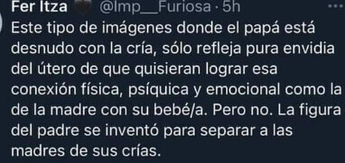 Ese comentario no tiene nada de feminista, al contrario, trata de perpetuar la idea machista que criar a los hijos es trabajo de la madre. Que si mostramos ternura y cariño no somos “machos”