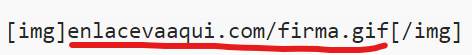 La firma la van a poner igual pero con el codigo, donde marque de rojo ahi es donde van a poner el link de su firma o imagen, asegurense que no exitan espacios entre el link y los ][