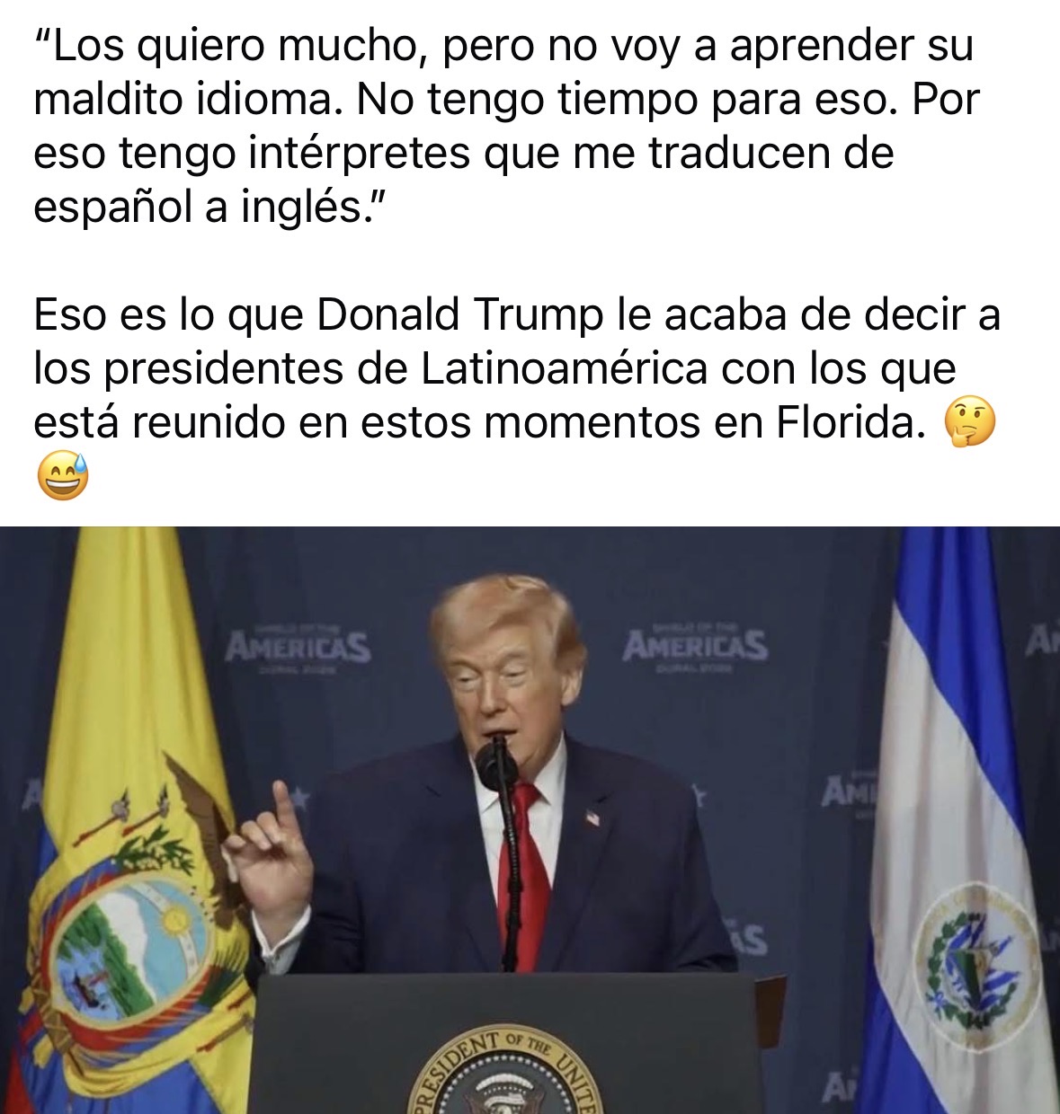 Trump y sus chistes pendejos . Pues que no aprenda , con que hable un solo idioma ya se nos hace bastante . No se le puede pedir más ,