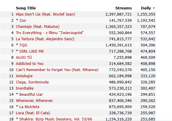 Shakira tiene muchísimas de canciones haciendo toneladas de stream diario.