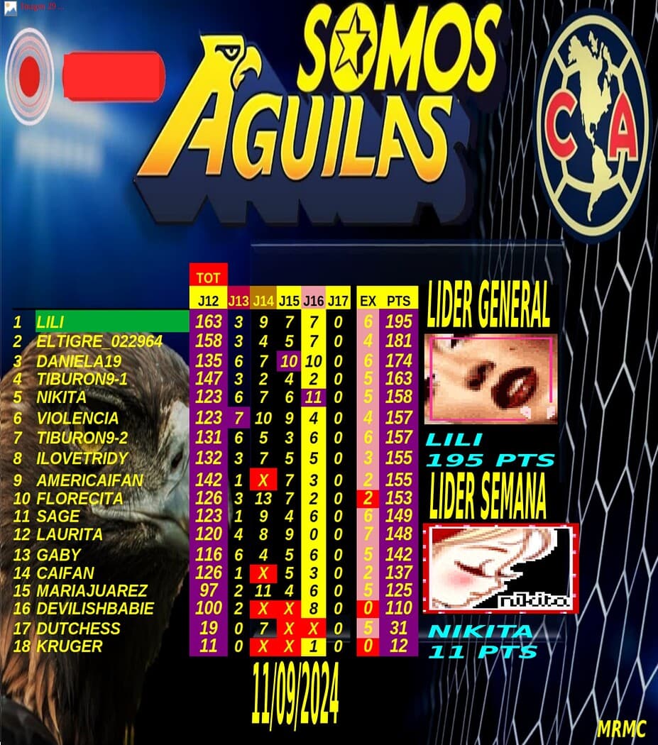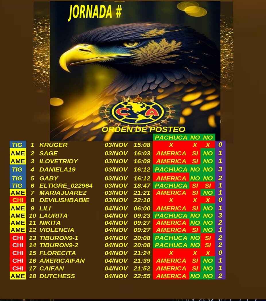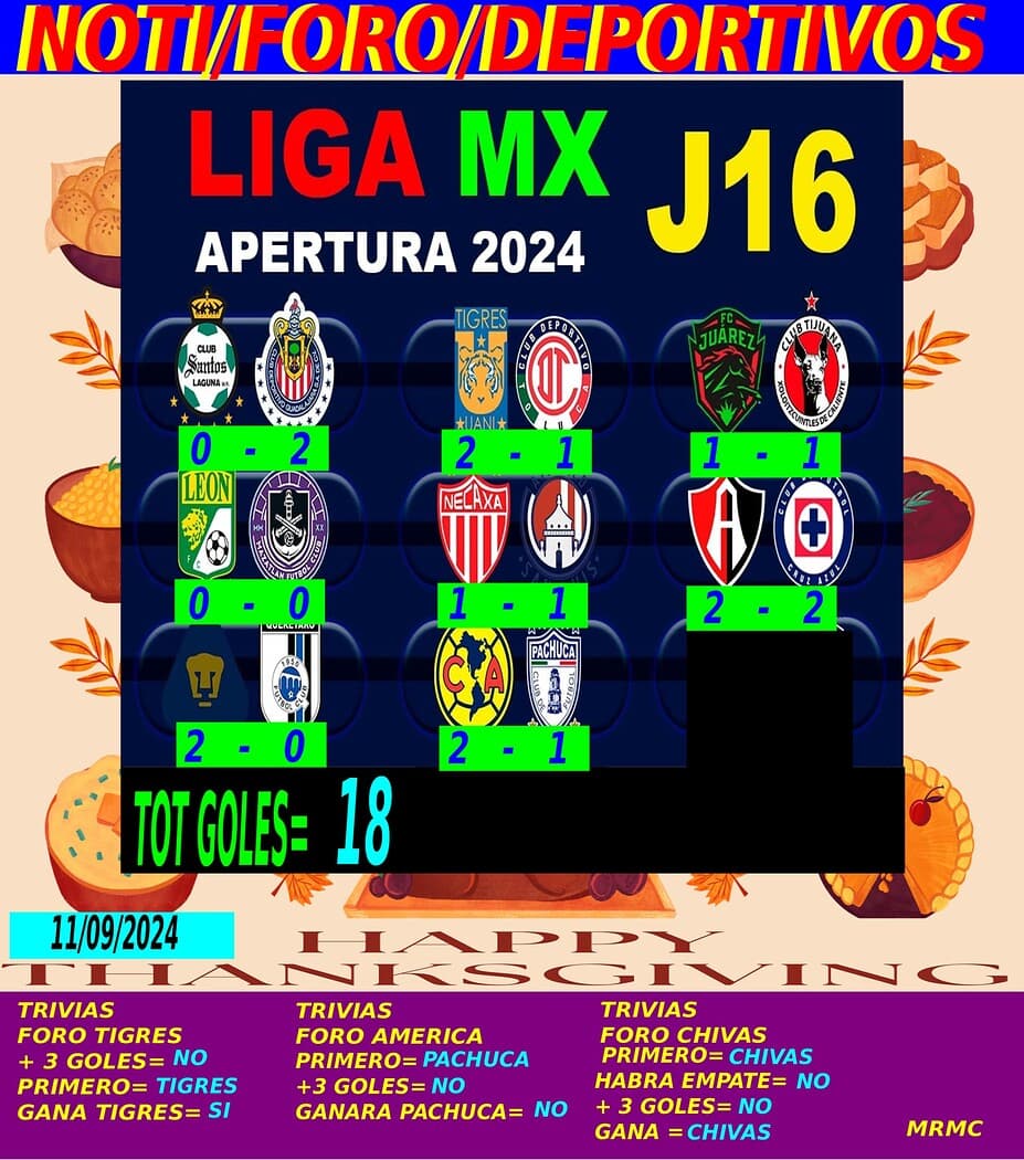 Gracias por participar en la Liga Mex '24 del foro America, si ven algún error o tienen alguna duda por favor avisen para resolverlo, los resultados de esta jornada 16 son los siguientes: