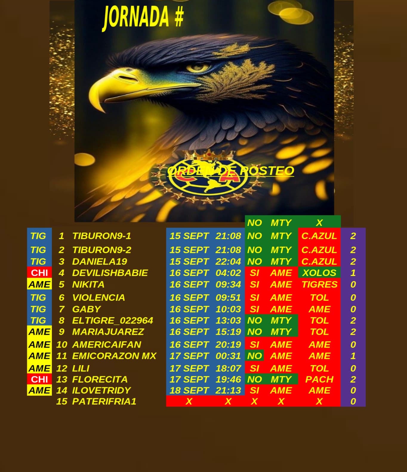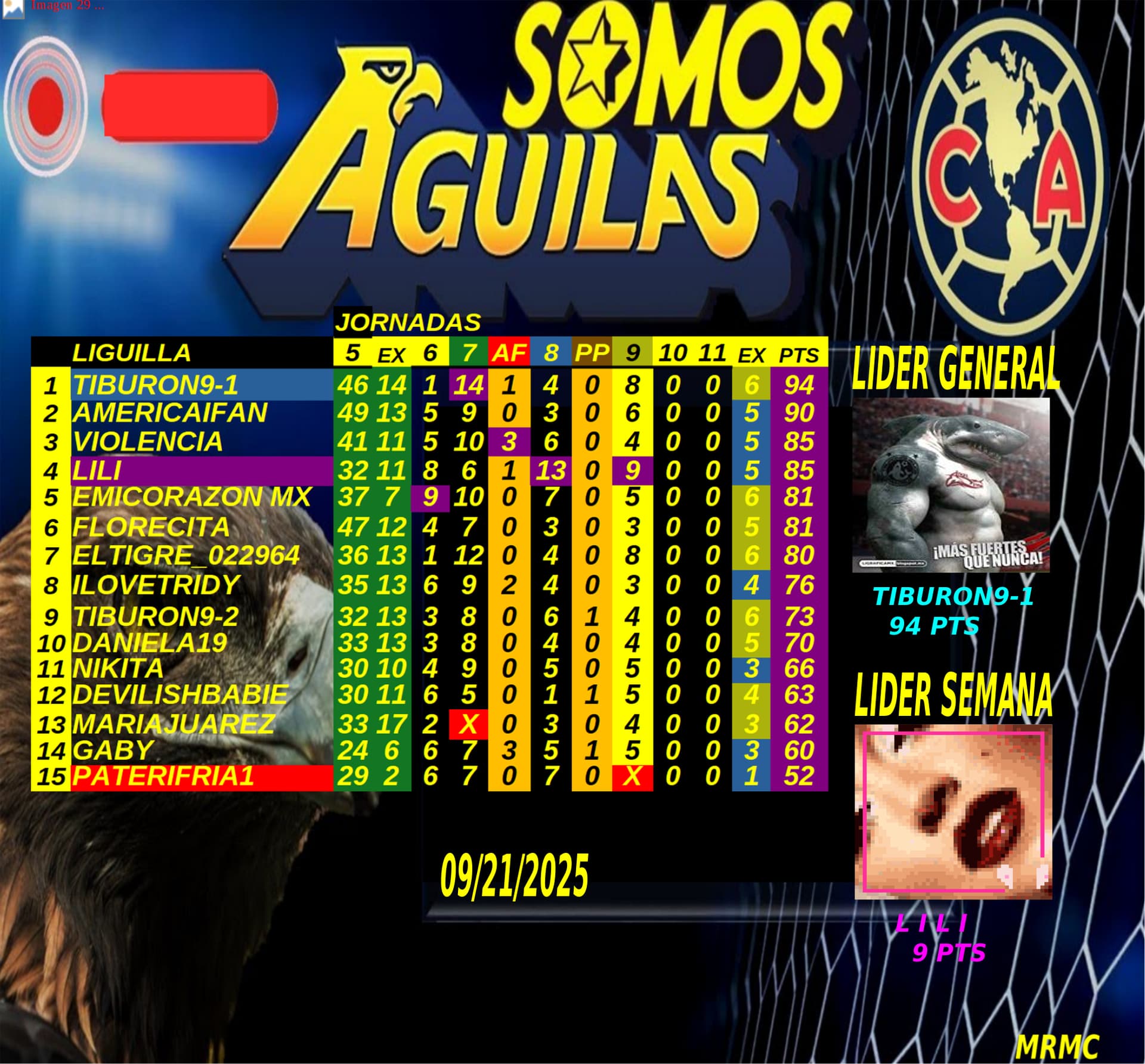 muchas felicidades para Tiburon @Tiburon_9 por ser líder general y a Lili @Lili por ser la líder de la jornada.