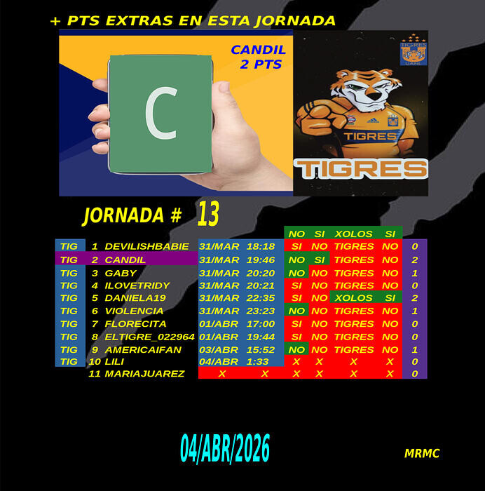 Y la líder de la semana es la prima @ILOVETRIDY con 132 puntos, y el líder de la semana es el doble colega de la prima @Violencia con 7 puntos, felicidades para ambos