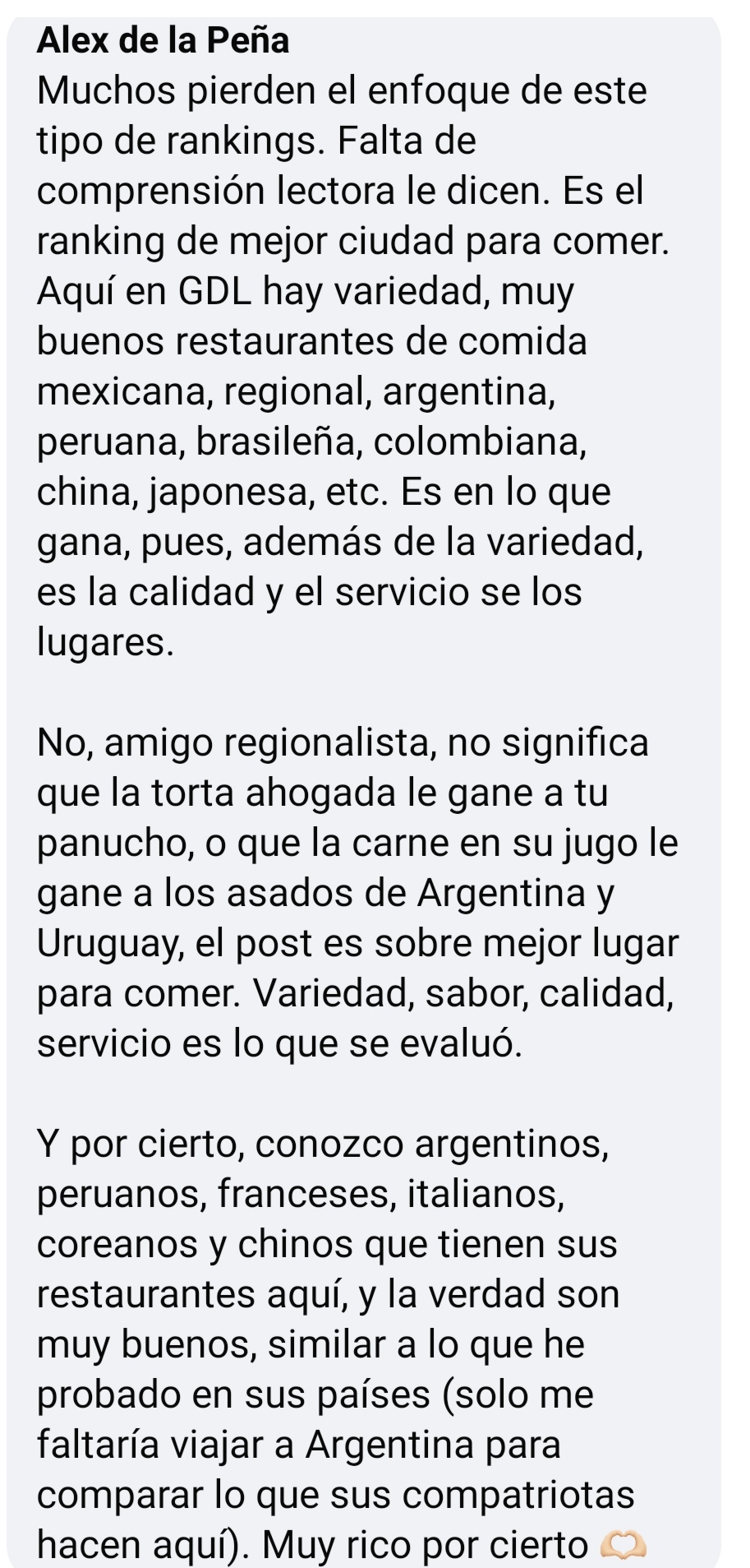 El ranking es “Mejores lugares para comer” y siendo Guadalajara una de las ciudades más turísticas en México, sería el colmo que no tuviera buenos restaurantes..