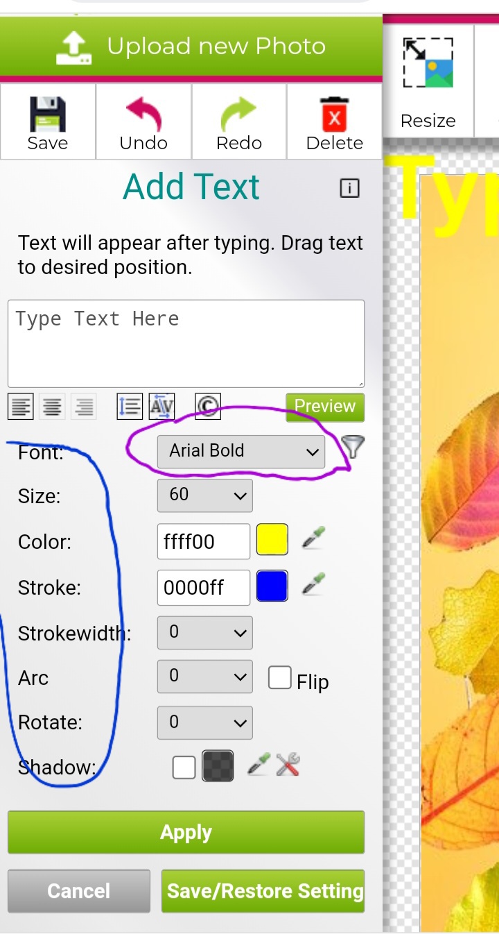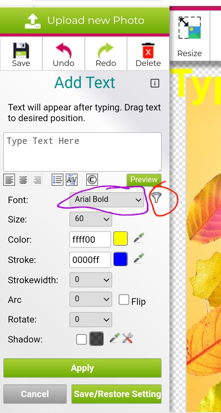 Si presionamos ahi donde dice “Arial bold” nos va a salir una lista de todos los diferentes tipos de letra que nos ofrece el sitio. (Circulo morado en la imagen de arriva)