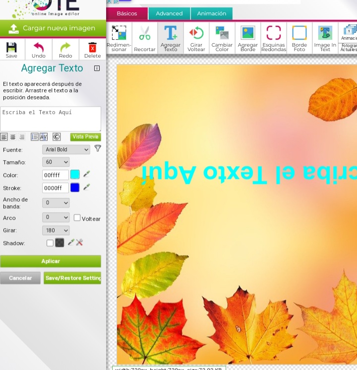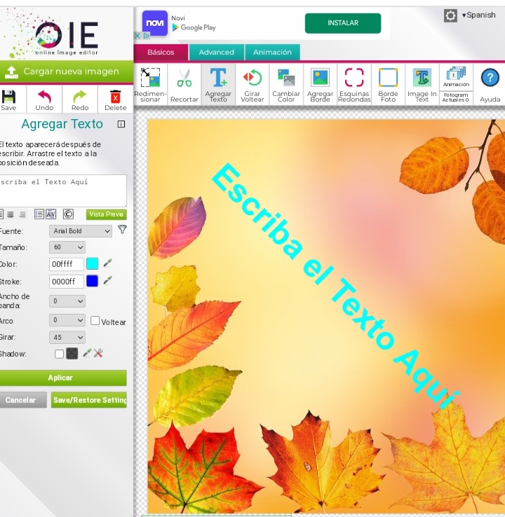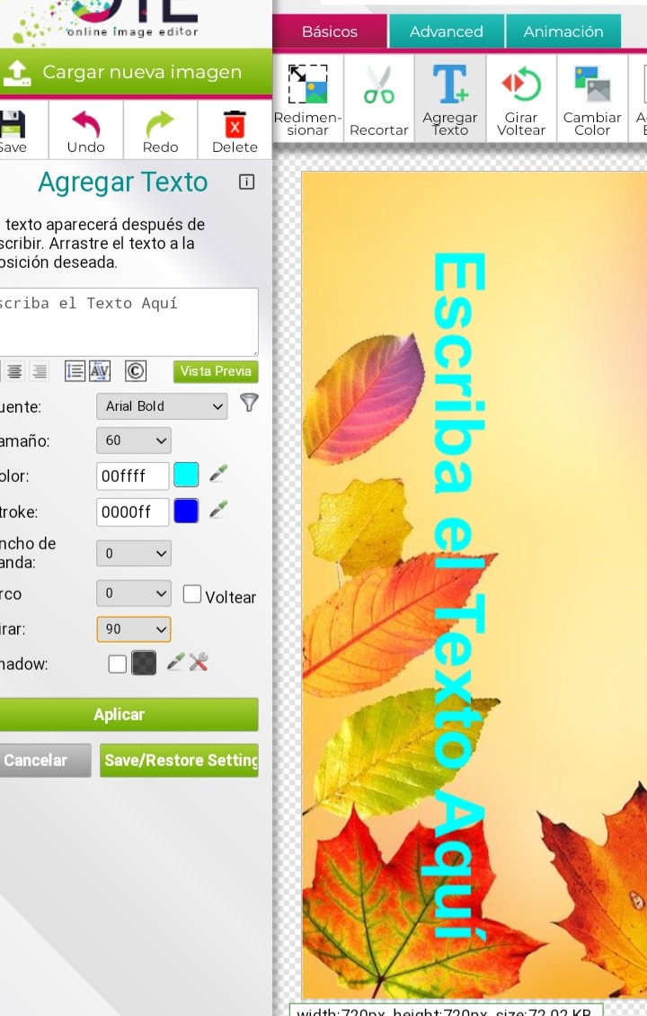 La siguiente opcion que nos da es la de “Girar” o "Rotate"en ingles, el texto. (Circulo azul)