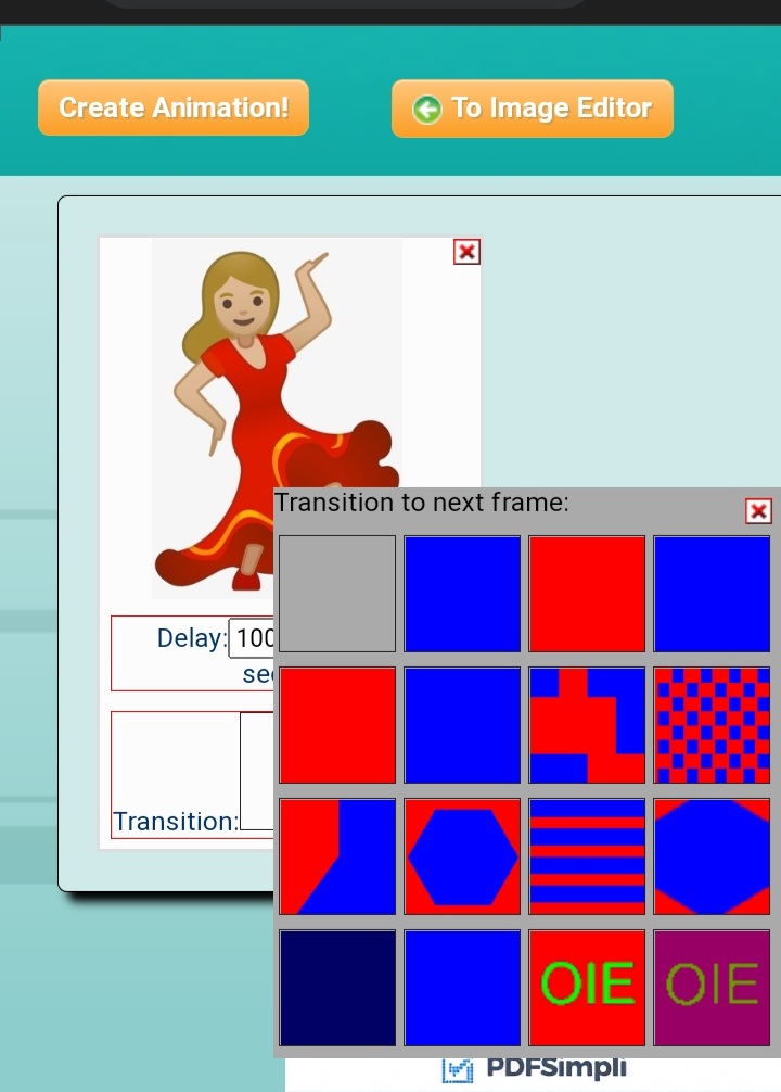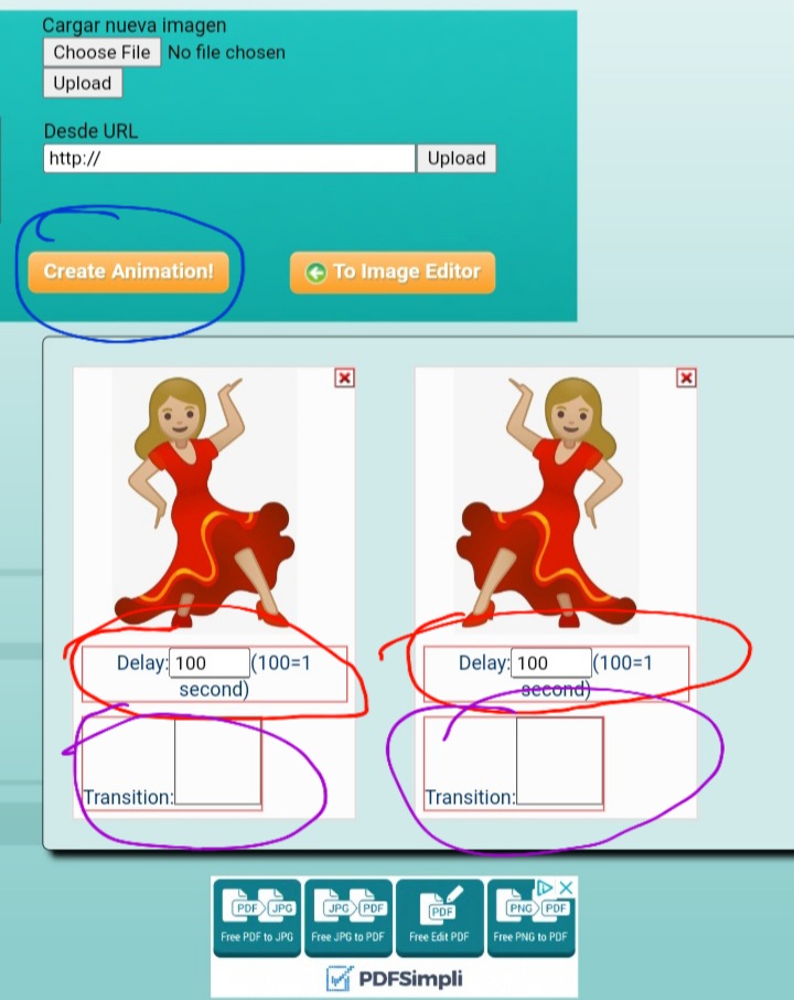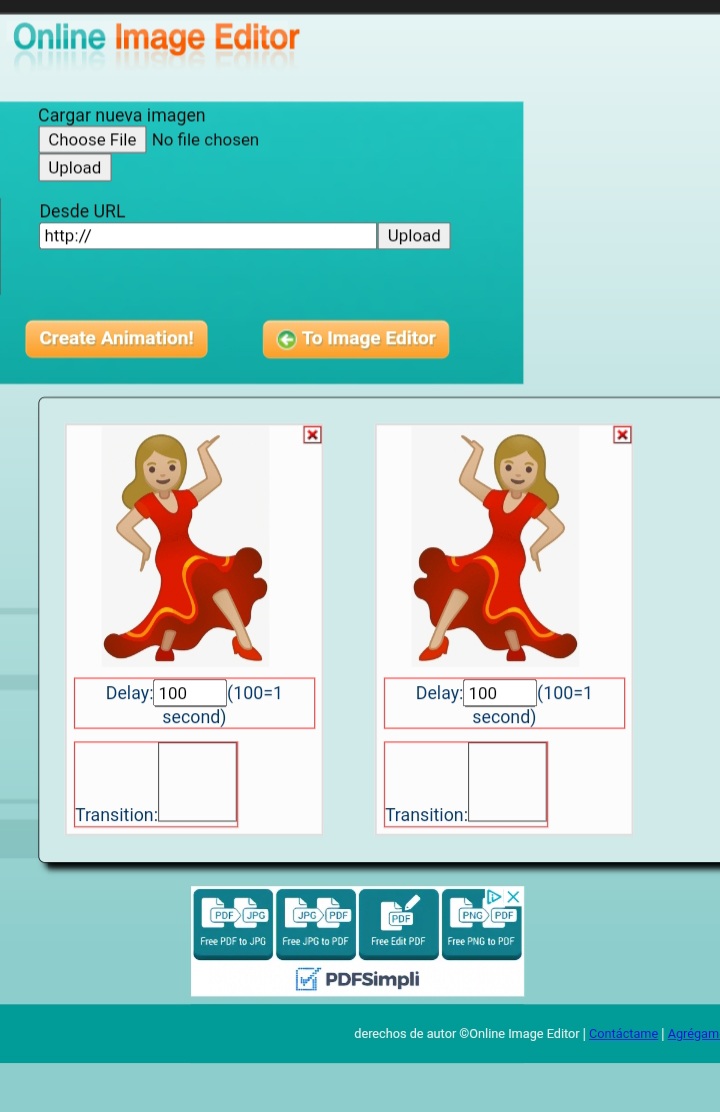 Delay son los segundos que cada imagen tarda antes de pasar a la siguiente. 100 es 1 segundo, 200 son 2 segundos… ect… es medio dificil cambiarle los segundos, del celular no funciona esa opcion. Y segun se de la computadora tambien se batalla un poco para que deje cambiar los segundos.