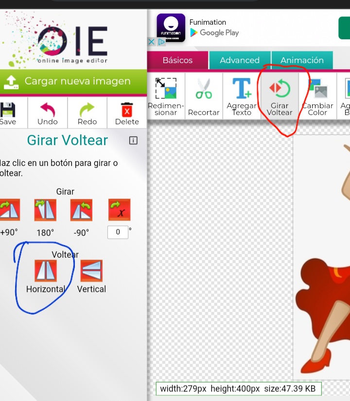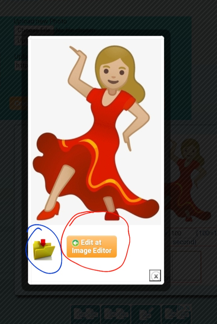 Eso nos llevara a la pantalla blanca con la nueva imagen creada. Donde nos dara las opciones de guardar, folder amarillo (circulo azul) o ir a image editor para seguir editando. (Circulo rojo)