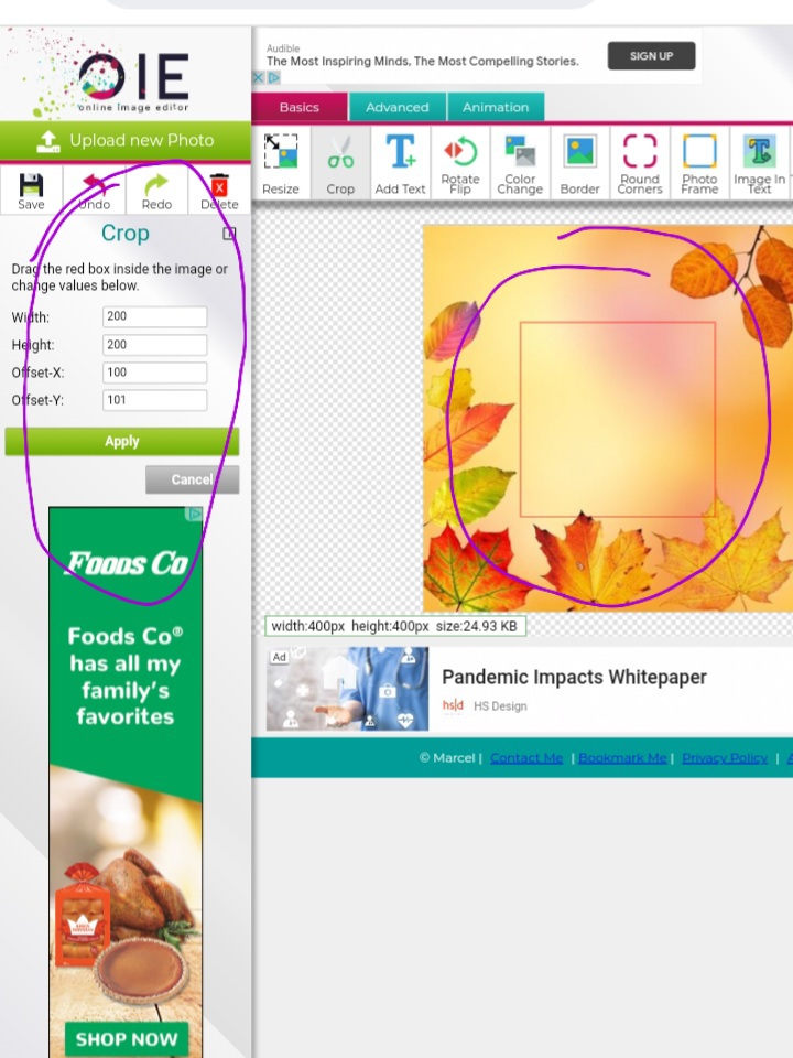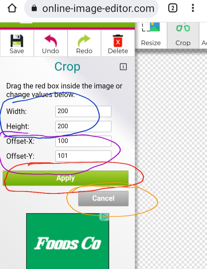 Tambien vemos las opciones de “Apply” o “Aplicar” (Circulo rojo) cuando ya este la imagen lista para recortar seleccionamos aplicar para que se hagan los cambios.