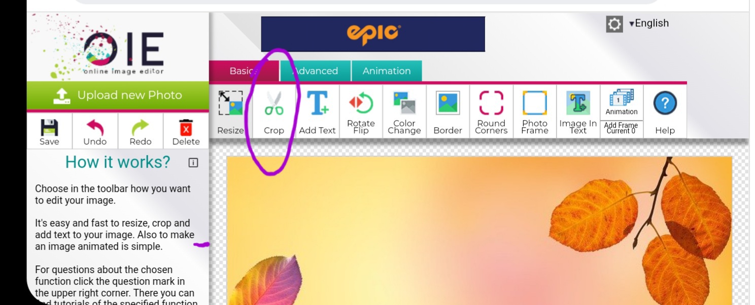 Para hacer eso vamos a seleccionar donde dice “crop” o “recortar” es la segunda opcion en la pestaña de basico. Tiene una tijeras como dibujo. (Circulo morado en la imagen de abajo)