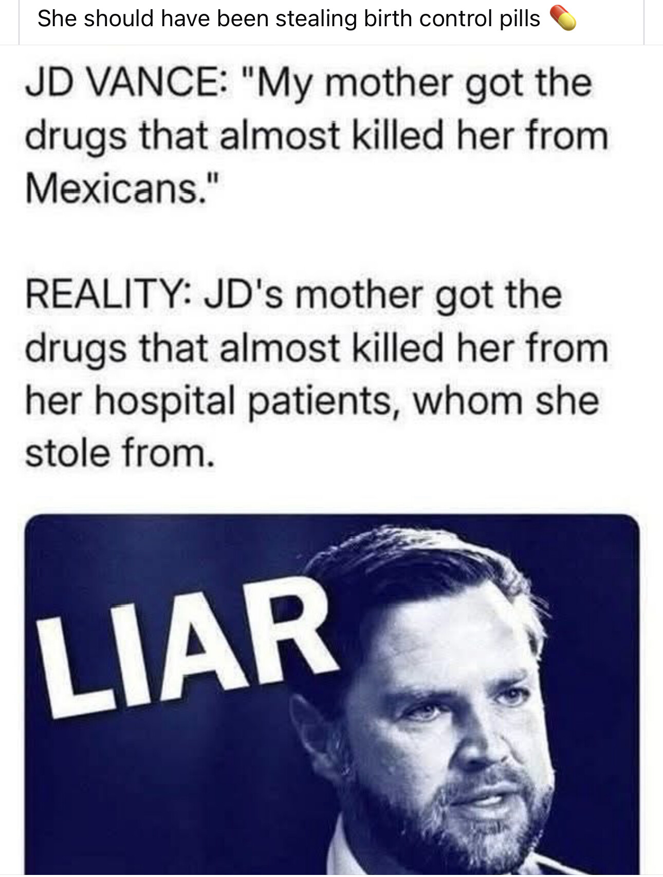 Y la vieja viciosa drogadicta mala madre de JD Vance se robaba las pastillas