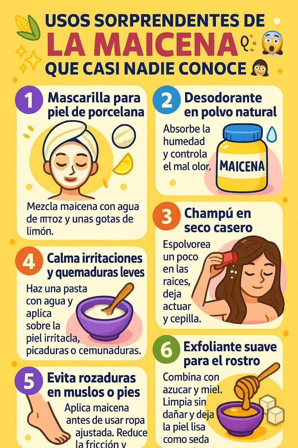 Muy buenos los tips…..la mascarailla  de maicena  es  excelente  para la piel y hace milagros…tiene efecto de  botox…en mi familia todas  desde mis abuelas la han usado  mezclada con leche  hasta formar una pasta fluida…  tambien mami  la ha usado   con laurel  y es efectiva…  ese tip  se  lo di a Juanita y le encanto.  Gracias  por compartir