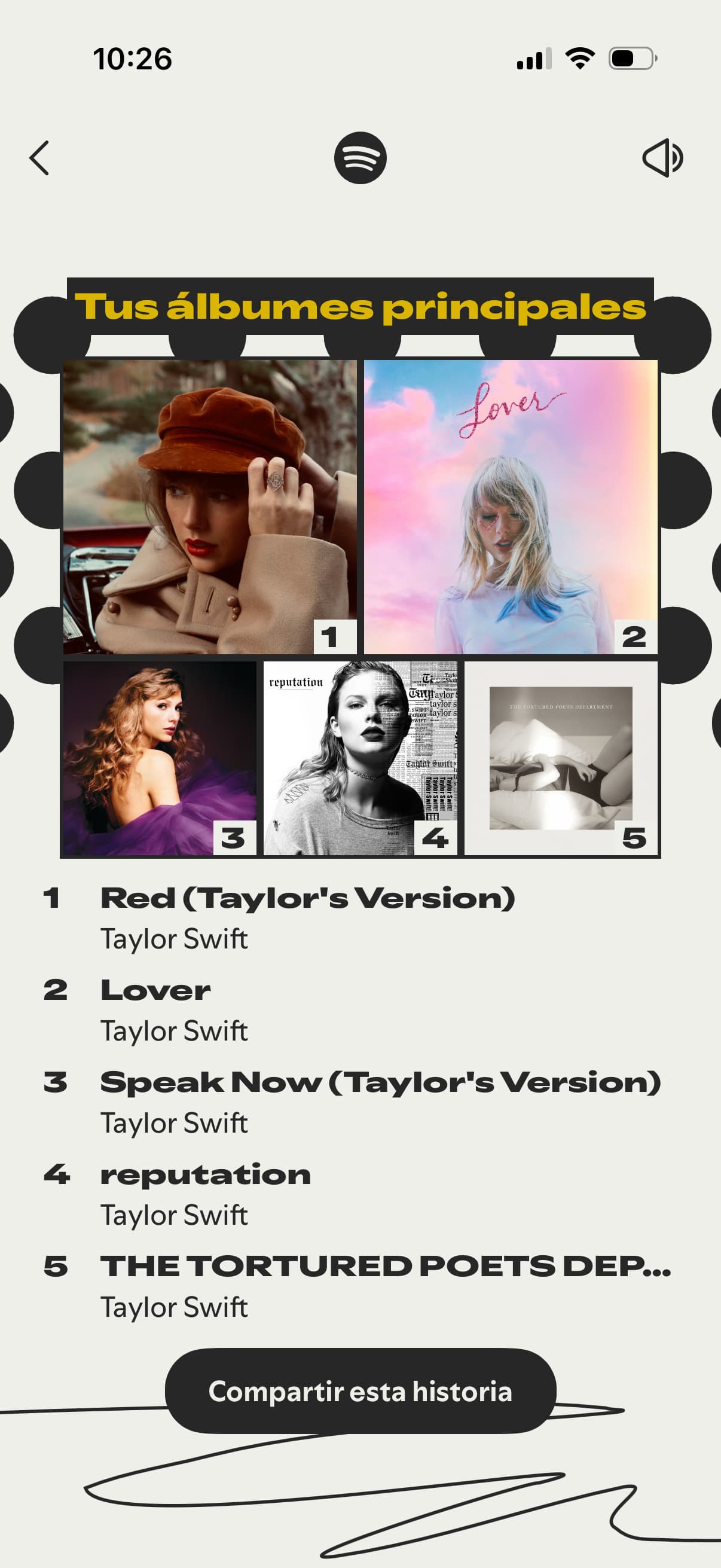Fui demasiado RED ERA este año, LOVER siempre me han encantado sus baladas, SPEAK ARTE por siempre el disco con el que empecé a amar a Taylor, REPUTA está solo por “Getaway Car” “Don’t Blame Me” “Delicate” y “King Of My Heart”, el resto del disco no me encanta…